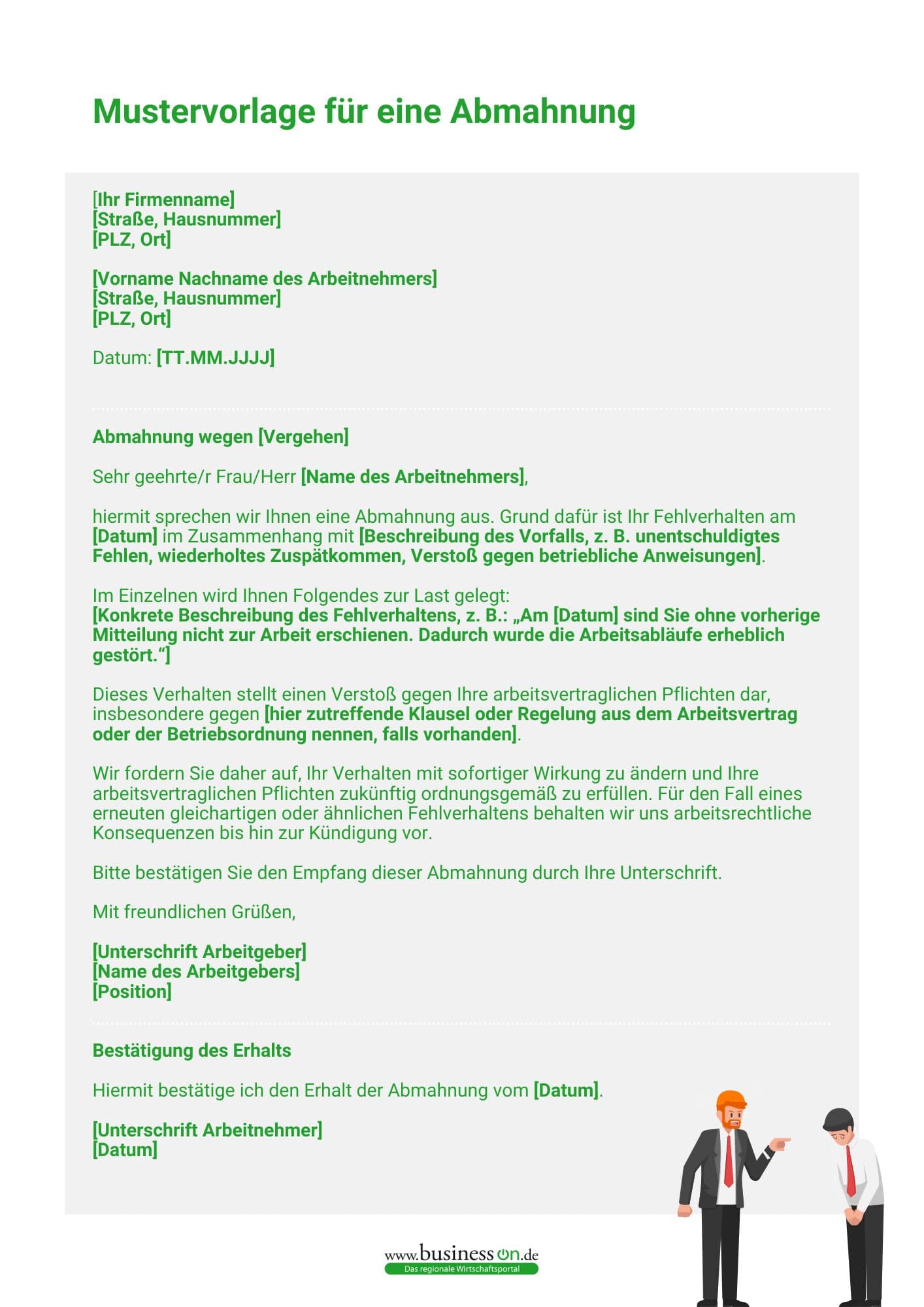 Doch wie sieht eine Abmahnung konkret aus? Die Abmahnung ist ein Dokument, das einen Titel und ein Datum enthält. Das Fehlverhalten wird umfassend beschrieben. Dabei geben Sie den Ort, das Datum und die Uhrzeit an. Wichtig ist, dass aus der Abmahnung klar hervorgeht, dass das Fehlverhalten nicht geduldet wird. Außerdem enthält jede Abmahnung die Androhung, dass eine Wiederholung des Fehlverhaltens zu einer Kündigung führen kann.