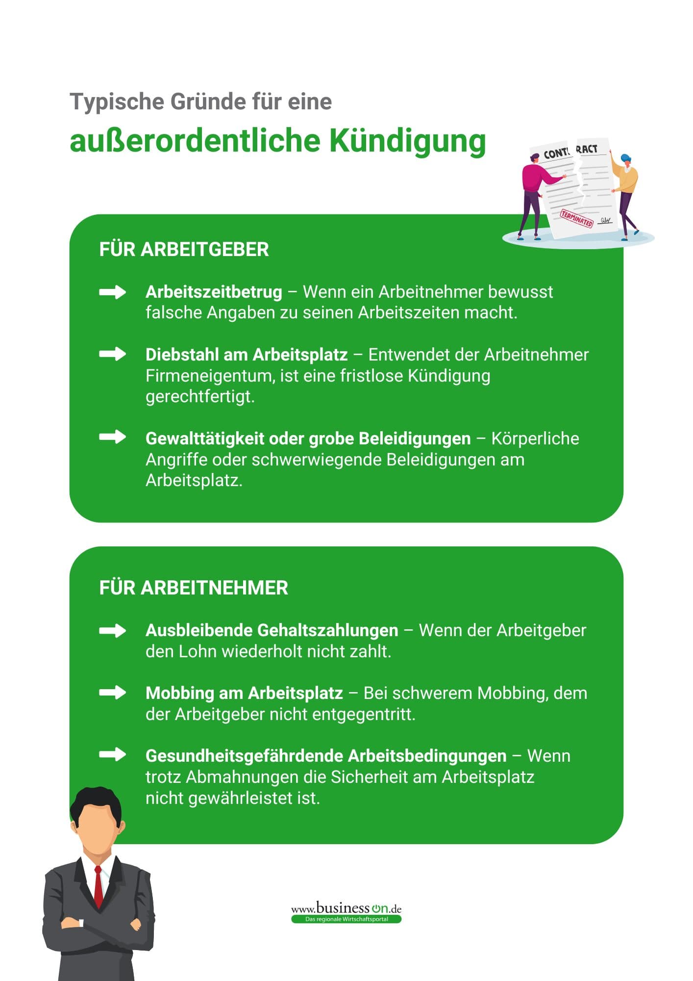 Wichtig zu wissen: Die außerordentliche Kündigung muss innerhalb von zwei Wochen nach Bekanntwerden des Kündigungsgrundes ausgesprochen werden. Diese Frist darf nicht überschritten werden, sonst verliert die Kündigung ihre Wirksamkeit.