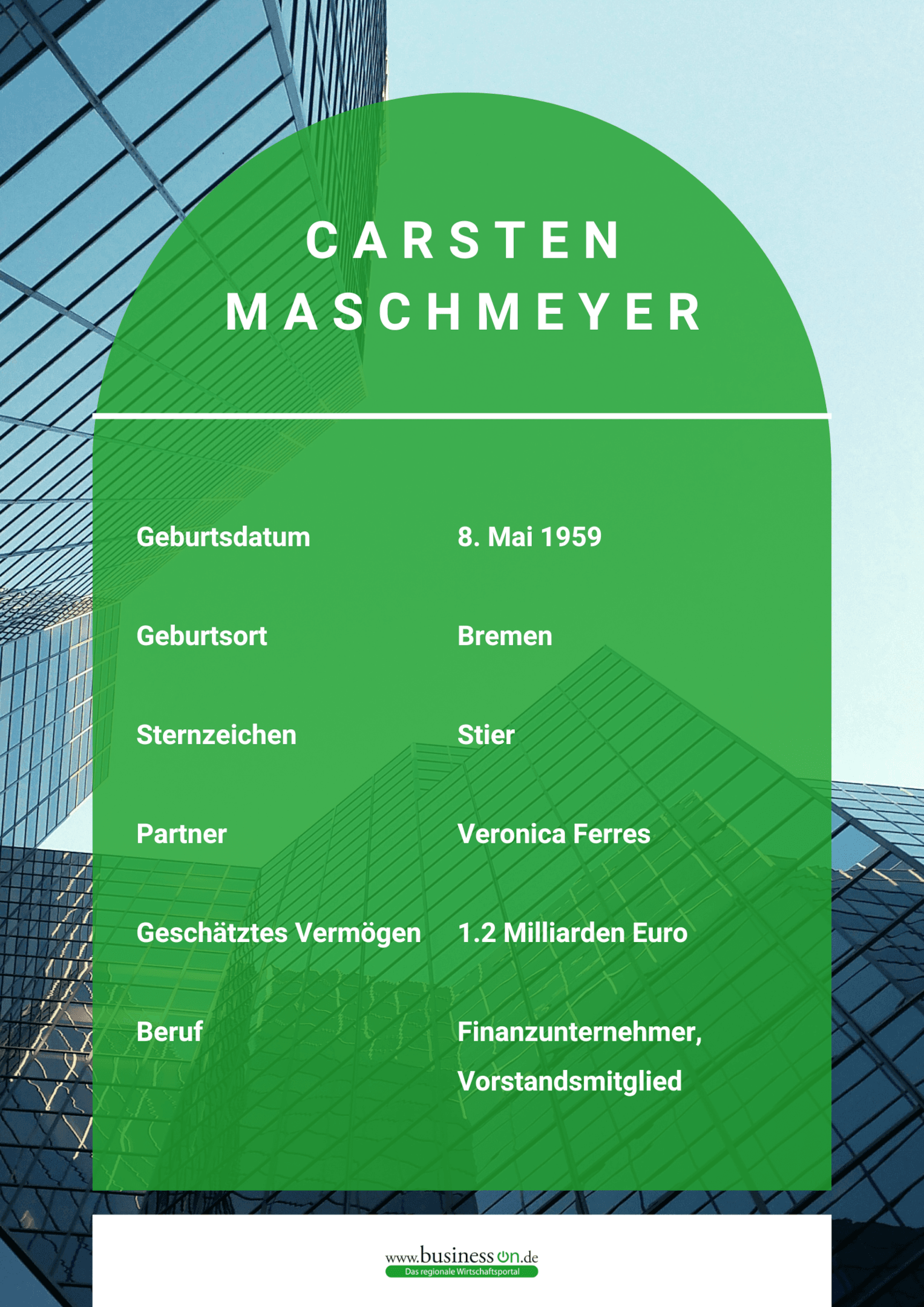 Carsten Maschmeyer zählt zu den reichsten Menschen Deutschlands. Sein Vermögen wird auf 1,2 Milliarden Euro geschätzt. Seit 2016 investiert der Unternehmer neben Nils Glagau, Judith Williams, Ralf Dümmel, Dagmar Wöhrl, Frank Thelen, Nico Rosberg und Georg Kofler in der Vox-Fernsehshow “Die Höhle der Löwen” in Start-ups. Dazu zählen Finanzguru, Nippli, THE PLANT BOX, Blufixx und nao.