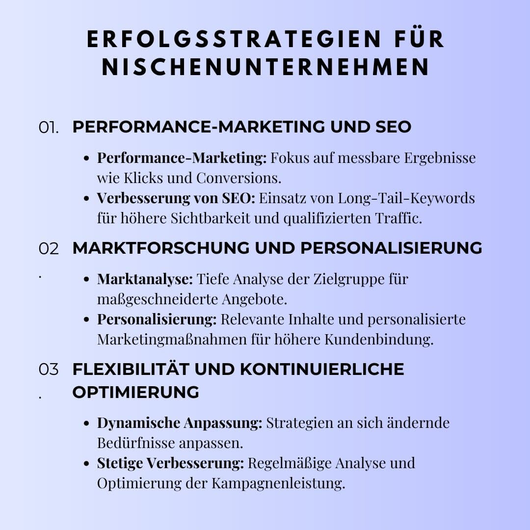 Eine präzise Marktanalyse und die Personalisierung des Kundenerlebnisses sind entscheidend für den Erfolg in Nischenmärkten. Unternehmen müssen die Bedürfnisse und Verhaltensweisen ihrer Zielgruppe genau verstehen, um maßgeschneiderte Angebote zu entwickeln.