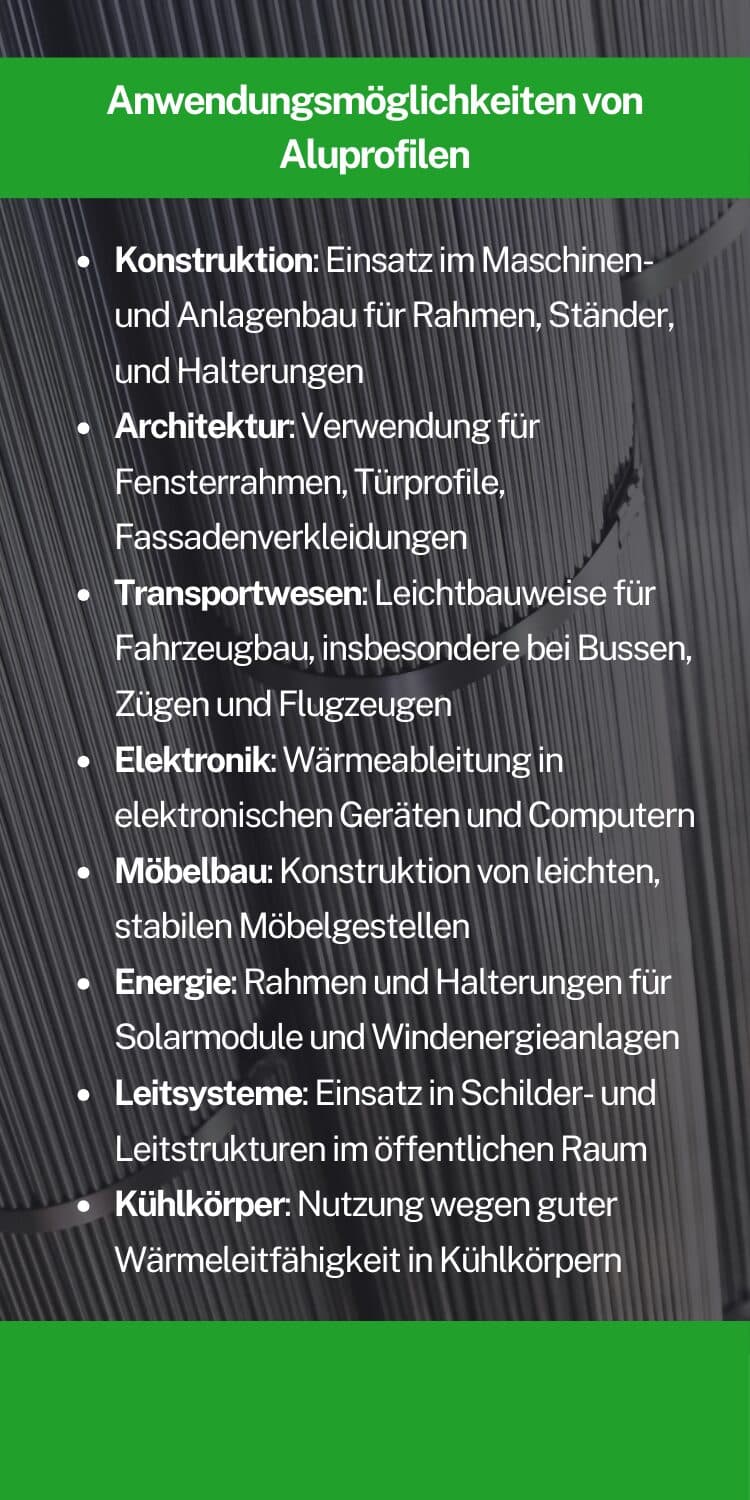 Arvid Vollstädt: Aluminium findet man heutzutage in allen Lebensbereichen und in allen Industriebranchen. Einige Beispiele sind hierbei die Möbelindustrie, der Automobil- und Flugzeugbau sowie der Innenausbau.