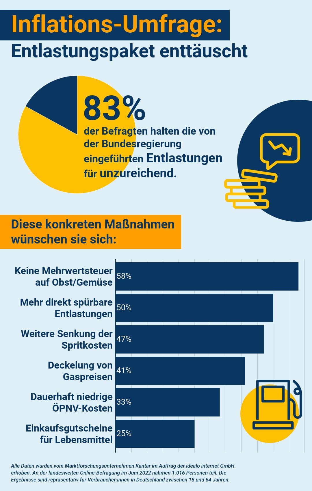 Das von der Regierung verabschiedete Entlastungspaket halten rund 83 Prozent der Befragten nicht für ausreichend. Vor allem in den Bereichen Energie und Lebensmittel wünschen sich zwei Drittel der Verbraucher:innen deshalb noch weitere Entlastungen. Zusätzlichen Handlungsbedarf sieht die Hälfte der Befragten außerdem bei den weiterhin hohen Kraftstoffkosten.