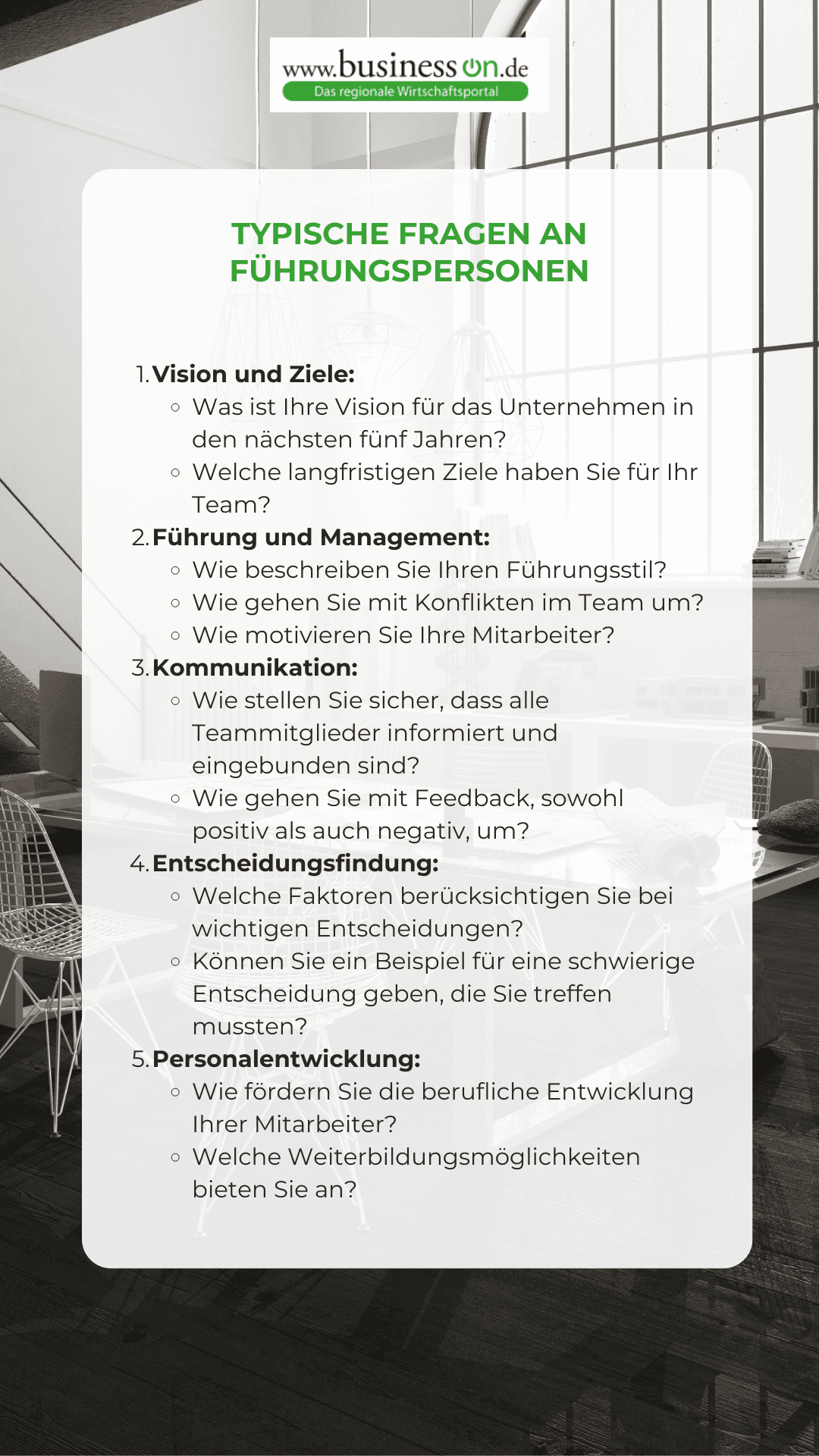 Bei dem Vorstellungsgespräch für die Besetzung einer Stelle mit Verantwortung erkundigen Sie sich als Geschäftsführer oder Führungsperson deswegen nach den individuellen Führungsqualitäten und den strategischen Fähigkeiten Ihres Gesprächspartners. Dabei widmen Sie sich insbesondere den bisherigen Erfahrungen des Bewerbers.