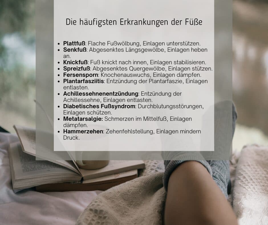 Einige der häufigsten Fußprobleme sind der Knick-Senk-Spreizfuß, Plattfuß, Hohlfuß, das Morton-Metatarsalgie-Syndrom, deformierte Zehen, Fersensporn, Schmerzen an der Achillessehne, Hallux Rigidus, Hallux Valgus, Ermüdungsbrüche und das diabetische Fußsyndrom. Eines haben sie alle gemeinsam: Ein kranker Fuß macht sich bei jedem Schritt bemerkbar und beeinträchtigt unsere Lebensqualität nachhaltig.