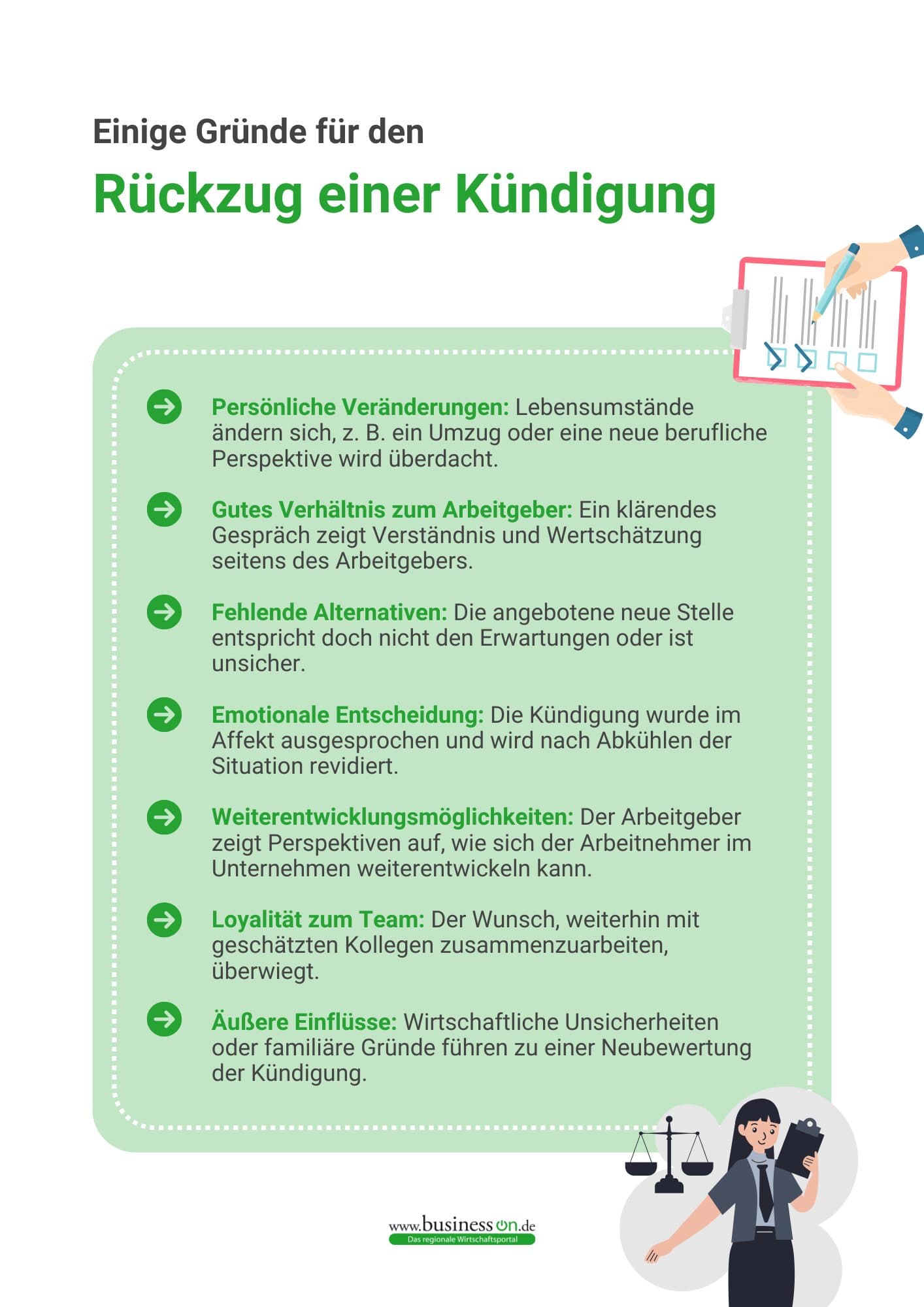 Ein rechtmäßiger Grund für die Rücknahme einer Kündigung liegt vor, wenn der ursprüngliche Kündigungsgrund entfällt oder sich als unbegründet herausstellt. Beispielsweise könnte eine betriebsbedingte Kündigung zurückgenommen werden, wenn ein unerwarteter Großauftrag eingeht und der Mitarbeiter dringend benötigt wird. Auch Missverständnisse oder formale Fehler in der Kündigungserklärung können Anlass sein, diese zurückzuziehen.