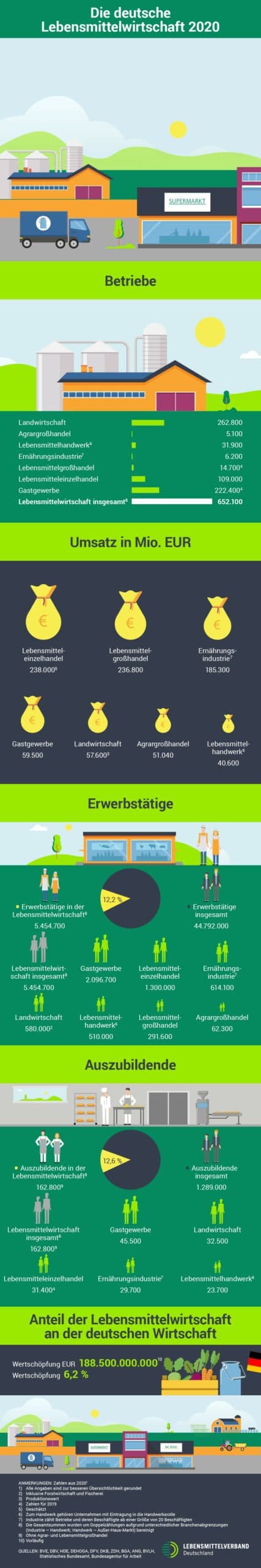 Den größten Umsatz erzielte der Lebensmitteleinzelhandel mit 238 Milliarden Euro (217 Milliarden im Vorjahr), gefolgt vom Lebensmittelgroßhandel mit 236,8 Milliarden Euro (230,4 Milliarden Euro im Vorjahr). Im Bereich der Landwirtschaft (57,6 Milliarden zu 60,4 Milliarden Euro), des Handwerks (40,6 Milliarden zu 42,6 Milliarden Euro) und des Agrargroßhandels (51 Milliarden zu 52,6 Milliarden Euro) ist der Umsatz jeweils leicht zurückgegangen. Insgesamt ist der Wertschöpfungsanteil der Branche leicht gesunken von 6,5 Prozent in 2019 auf 6,2 Prozent in 2020. Das entspricht 188,5 Milliarden Euro (Vorjahr 199,5 Milliarden Euro).