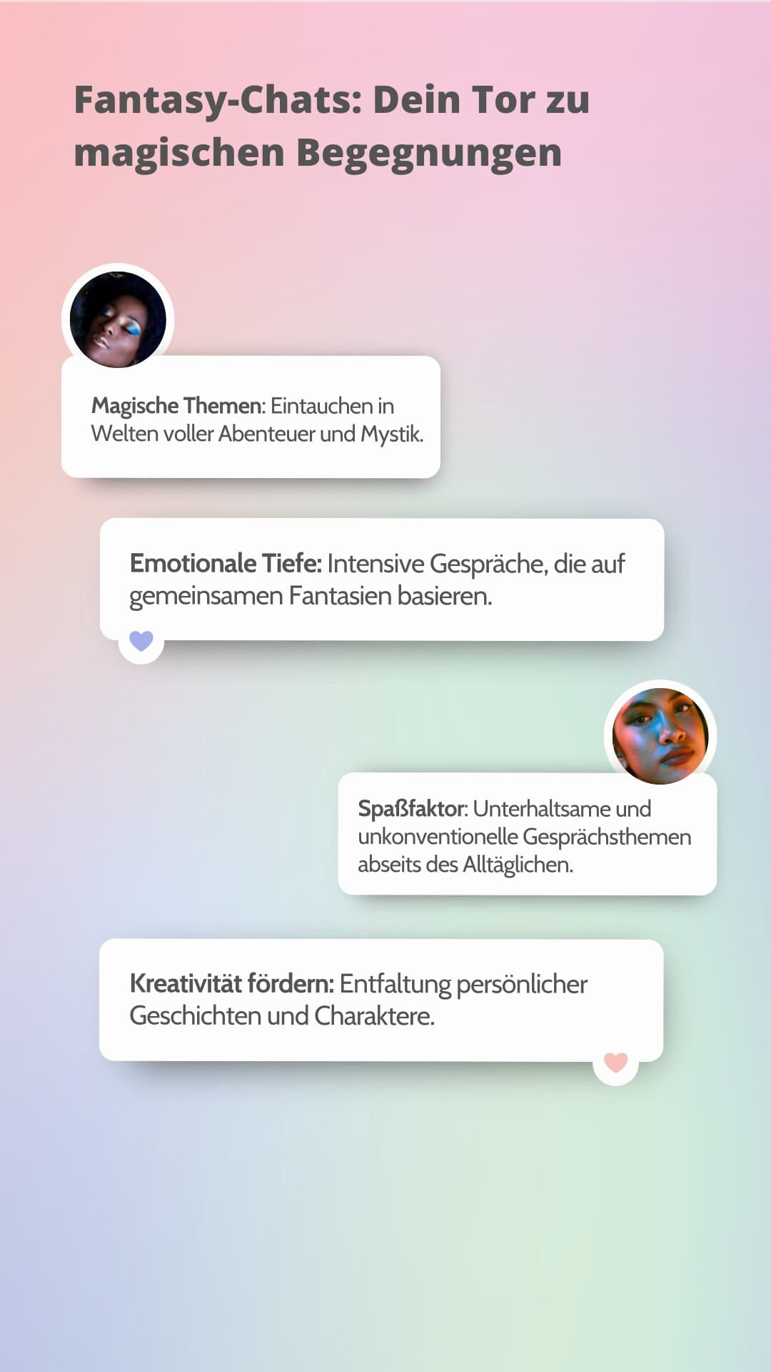 Die Kernfunktion von MichVerlieben.com sind die innovativen Fantasy-Chats. Diese ermöglichen es Nutzern, sich von den Fesseln des Alltags zu befreien und in Rollenspiele einzutauchen, die das Potenzial haben, tiefgreifende und aufregende Erfahrungen zu bieten. Hier kann jeder Nutzer Charaktere und Szenarien erkunden, die im realen Leben unzugänglich wären, was eine ganz neue Form der Selbstentdeckung und des Ausdrucks bietet.
