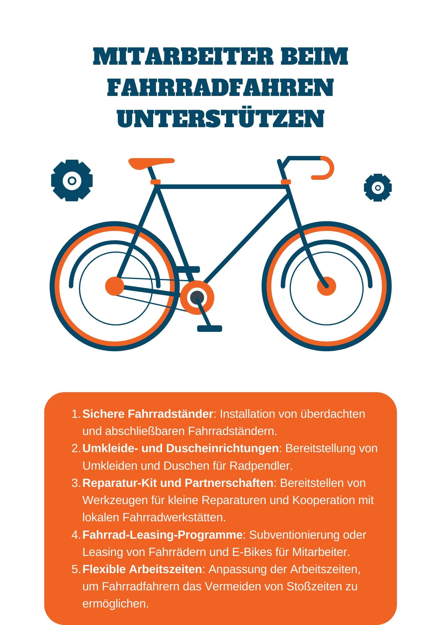 - Bereitstellung betriebseigener Fahrräder für Dienstreisen oder private Nutzung durch Leasingmodelle.