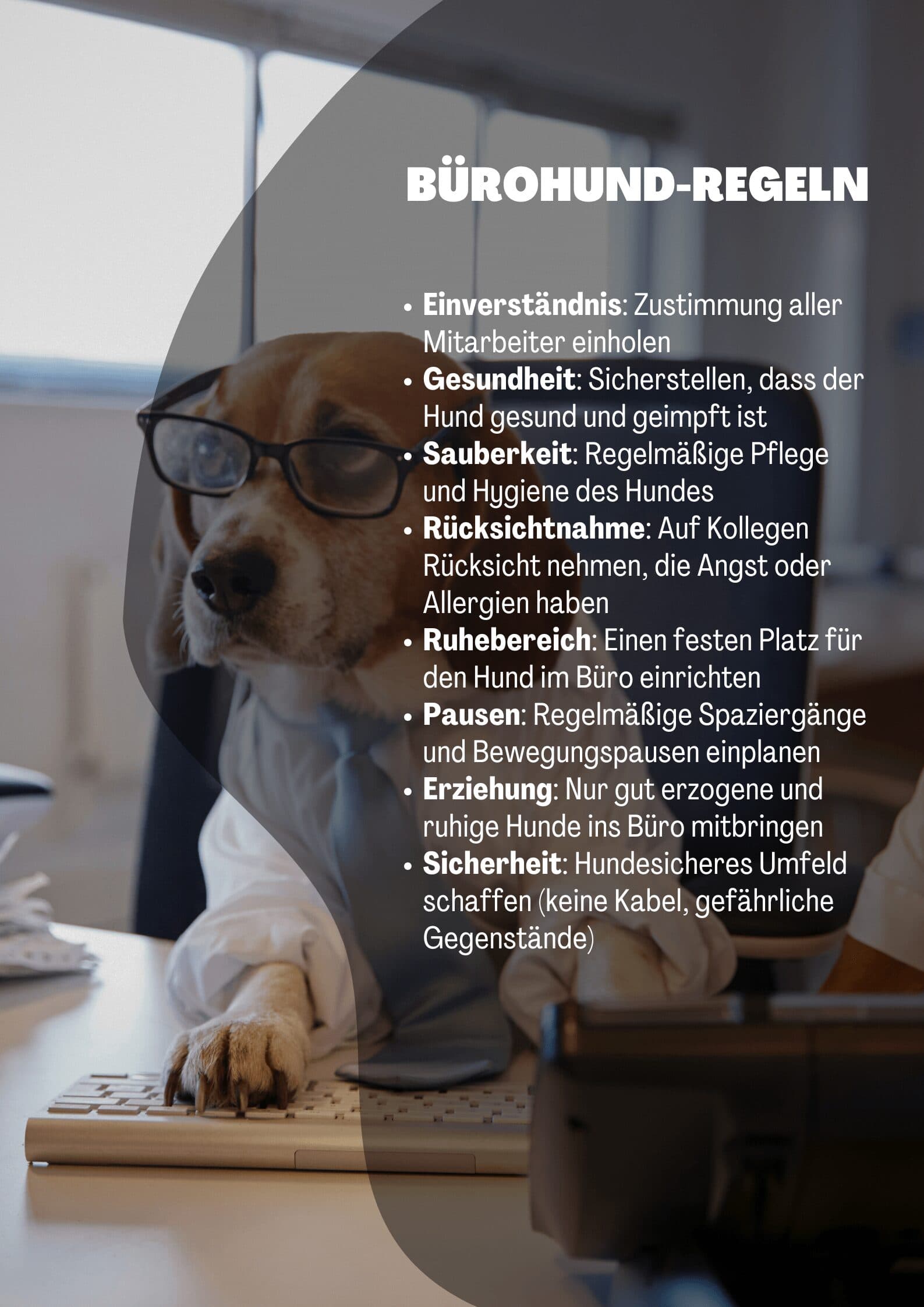 Wurde der Bürohund erstmal genehmigt, sollten klare Spielregeln aufgestellt werden, um einen reibungslosen Arbeitsalltag zu gewährleisten. Diese Regeln müssen von allen Beteiligten eingehalten werden und könnten folgendermaßen aussehen: