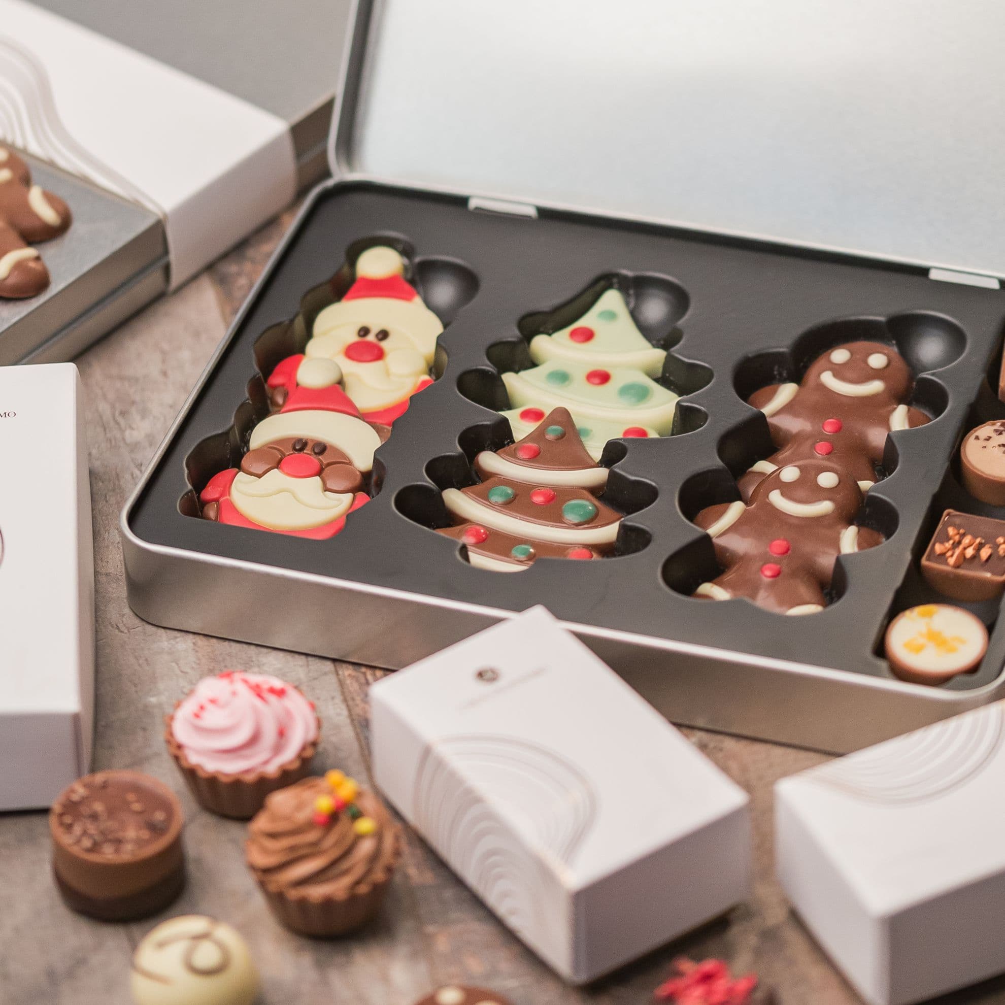 Auch mit Schokoladentafeln und -figuren kann CHOCOLISSIMO auftrumpfen. Vom traditionellen Schoko-Weihnachtsmann, über Schoko-Rentiere, bis hin zu Lebkuchenmännchen und Weihnachts-Schokokugeln ist alles dabei. Kleine, liebevolle Details machen die Schokoladenfiguren zu etwas ganz Besonderem. Auch hier wird ein psychologischer Effekt bedient: wie wir alle wissen, isst das Auge schließlich mit