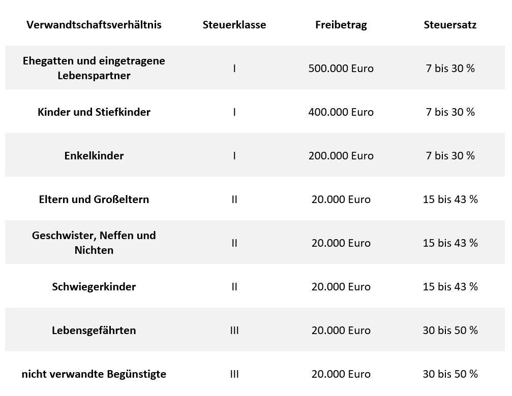 Die Höhe der Steuerfreibeträge ist in § 16 ErbStG geregelt. Hiernach liegen die persönlichen Freibeträge für Ehepartner, eingetragene Lebenspartner bei 500.000 Euro, für Kinder, Stiefkinder bei 400.000 Euro, für Enkel 200.000 Euro und für übrige Beschenkte bei 20.000 Euro.