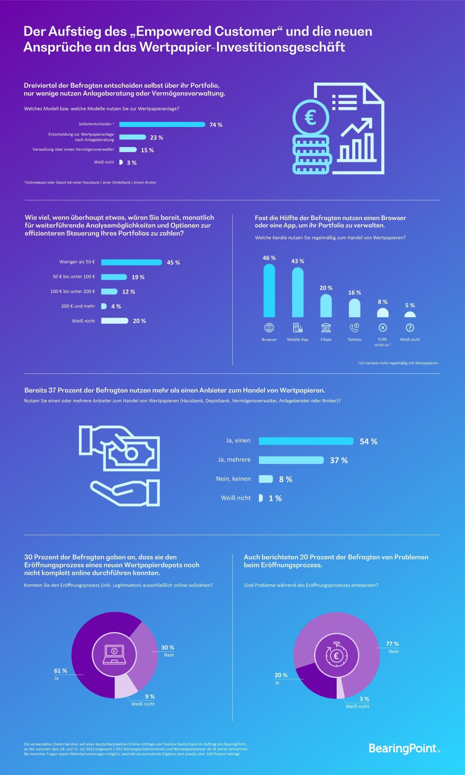 Selbstentscheider- und entscheiderinnen sind im Wertpapiergeschäft auf dem Vormarsch. Das ist eines der Kernergebnisse einer aktuellen, deutschlandweiten Umfrage von BearingPoint im Rahmen einer Studie zum Thema „Effizientes Wertpapiergeschäft und digitales Kundenerlebnis. Die Umfrage ergibt das Bild eines zunehmend „Empowered Customers“, – also von Kund:innen, die weniger von einer Anlageberatung abhängig sind, sondern durch bereitgestellte Analysen und Steuerungsmöglichkeiten selbst zu Entscheider:innen über das Schicksal des eigenen Portfolios werden. So gaben etwa Dreiviertel der Befragten an, selbst über ihr Portfolio zu entscheiden, während nur wenige die Beratung einer Vermögensverwaltung oder Anlageberatung in Anspruch nehmen würden.