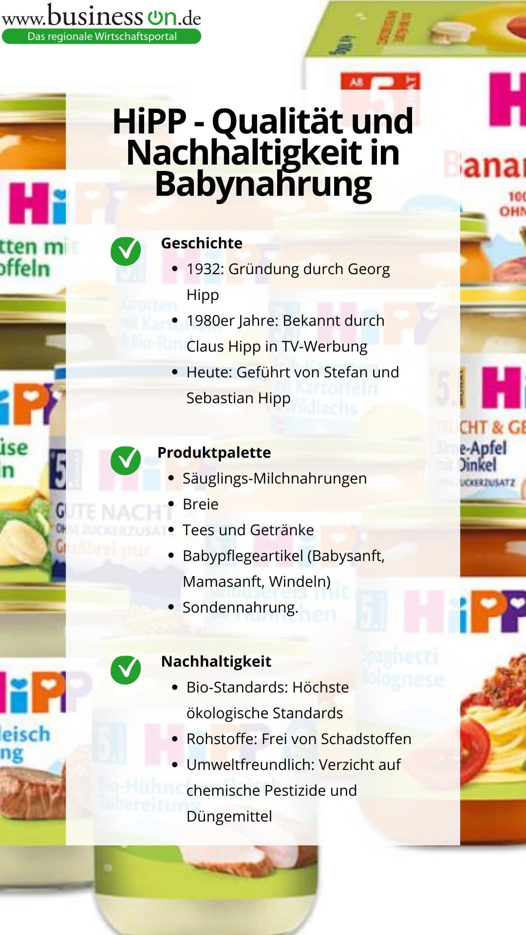 Die inzwischen in der Schweiz beheimatete HiPP Holding ist einer der führenden Produzenten von Babynahrung. Ihr umfangreiches Produktsortiment umfasst Säuglings-Milchnahrungen, Breie, Tees, Beikost und Getränke. Besonders hervorzuheben sind die Bio-Produkte für Kinder sowie die Babypflegeartikel wie Babysanft, Mamasanft und Windeln. Zusätzlich bietet HiPP auch spezielle Säfte und Tees für Schwangere und Stillende an, ebenso wie Sondennahrung.