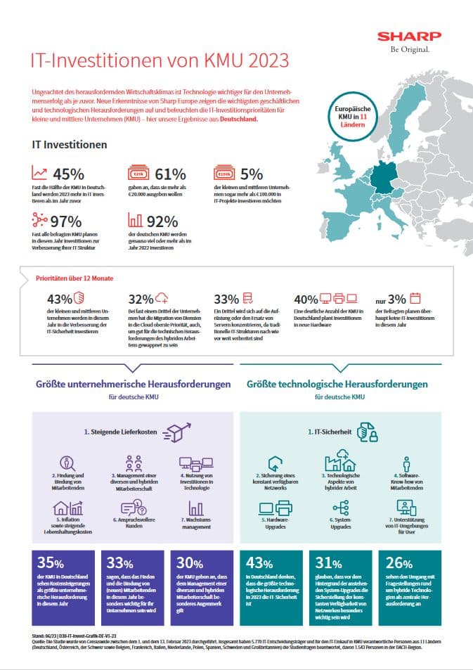 Im Rahmen der Studie hat Sharp die KMU-Entscheider befragt, mit welchen Herausforderungen sie sich aktuell konfrontiert sehen und denen sie in den kommenden zwölf Monaten die höchste Priorität einräumen. Demzufolge sieht fast die Hälfte (43 Prozent) der befragten deutschen KMU das Thema IT-Sicherheit als dringlichstes Problem. Für 31 Prozent steht die Gewährleistung ununterbrochener Netzwerkfunktionalität im Fokus. Weitere 35 Prozent befürchten steigende Lieferkosten, und 33 Prozent bereitet das Thema Fachkräftemangel Kopfzerbrechen.