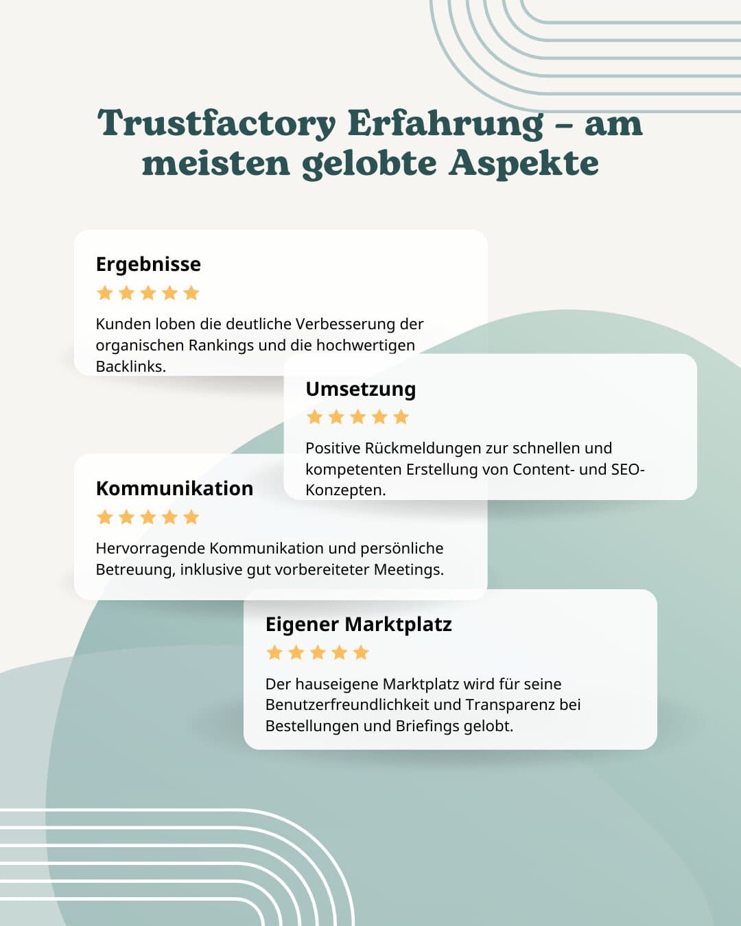 Auf Trustpilot bewerteten die Kunden Trustfactory zum großen Teil positiv. 83 Prozent der Nutzer von Trustpilot vergaben 5 von 5 Sterne und damit die volle Punktzahl. Gelobt werden vor allem die Ergebnisse, die Umsetzung der Content-Erstellung und der effektive Autoritätsaufbau durch Contentplatzierungen in den Medien.