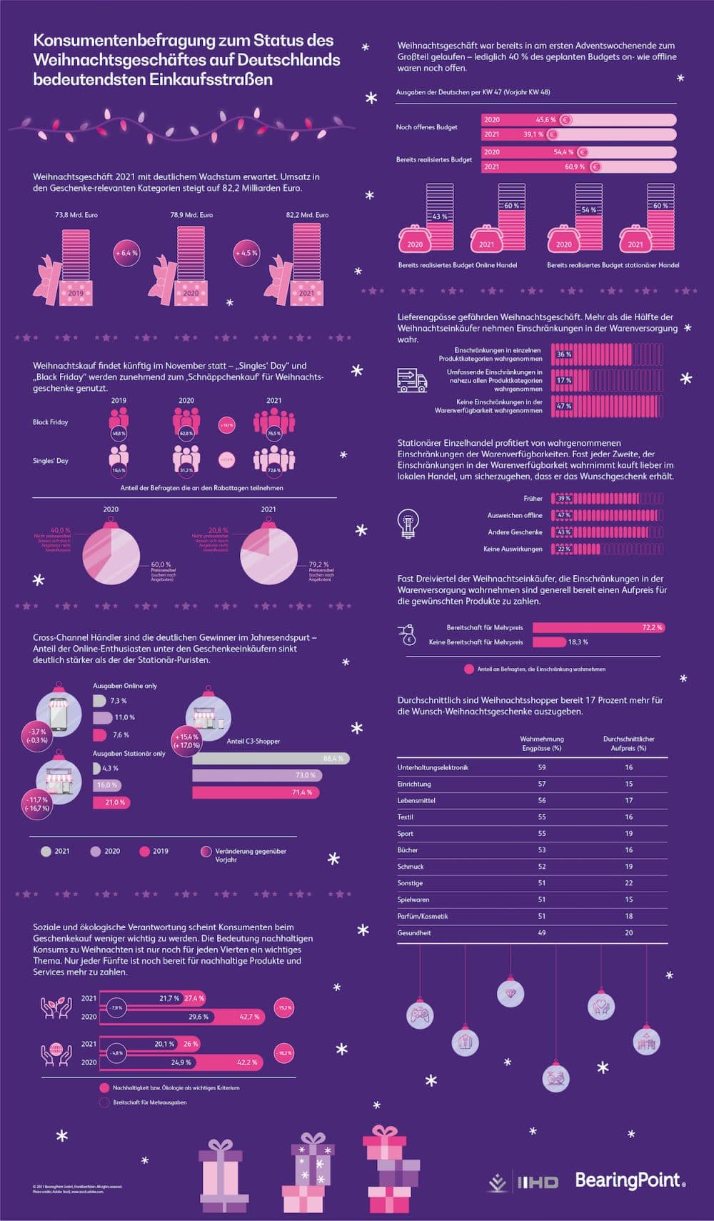 Im diesjährigen Weihnachtsgeschäft ist von einem deutlichen Umsatzanstieg von rund fünf Prozent in den Geschenke-relevanten Produktkategorien auszugehen. Die durchweg positive Entwicklung der Konjunktur-, Handels- und Konsumindikatoren lässt auf ein Umsatzvolumen von insgesamt 82,2 Milliarden Euro schließen. Zu diesem Ergebnis kommt die neue Studie der Unternehmensberatung BearingPoint und des IIHD Instituts zum Weihnachtsgeschäft 2021.