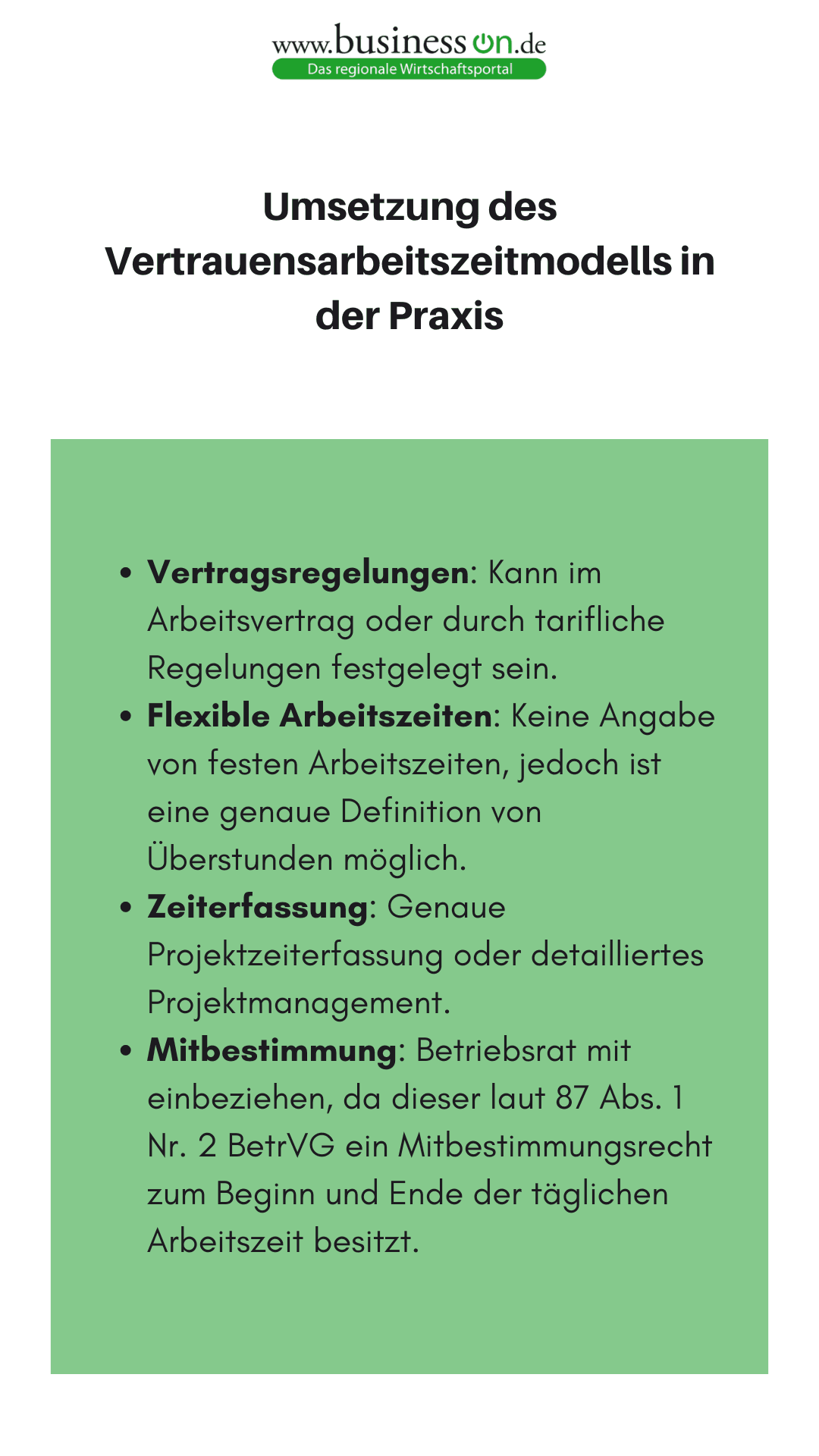 Welche Dinge hinsichtlich der praktischen Umsetzung von Vertrauensarbeitszeit im Unternehmen von Bedeutung sind, kann der folgenden Infografik entnommen werden.