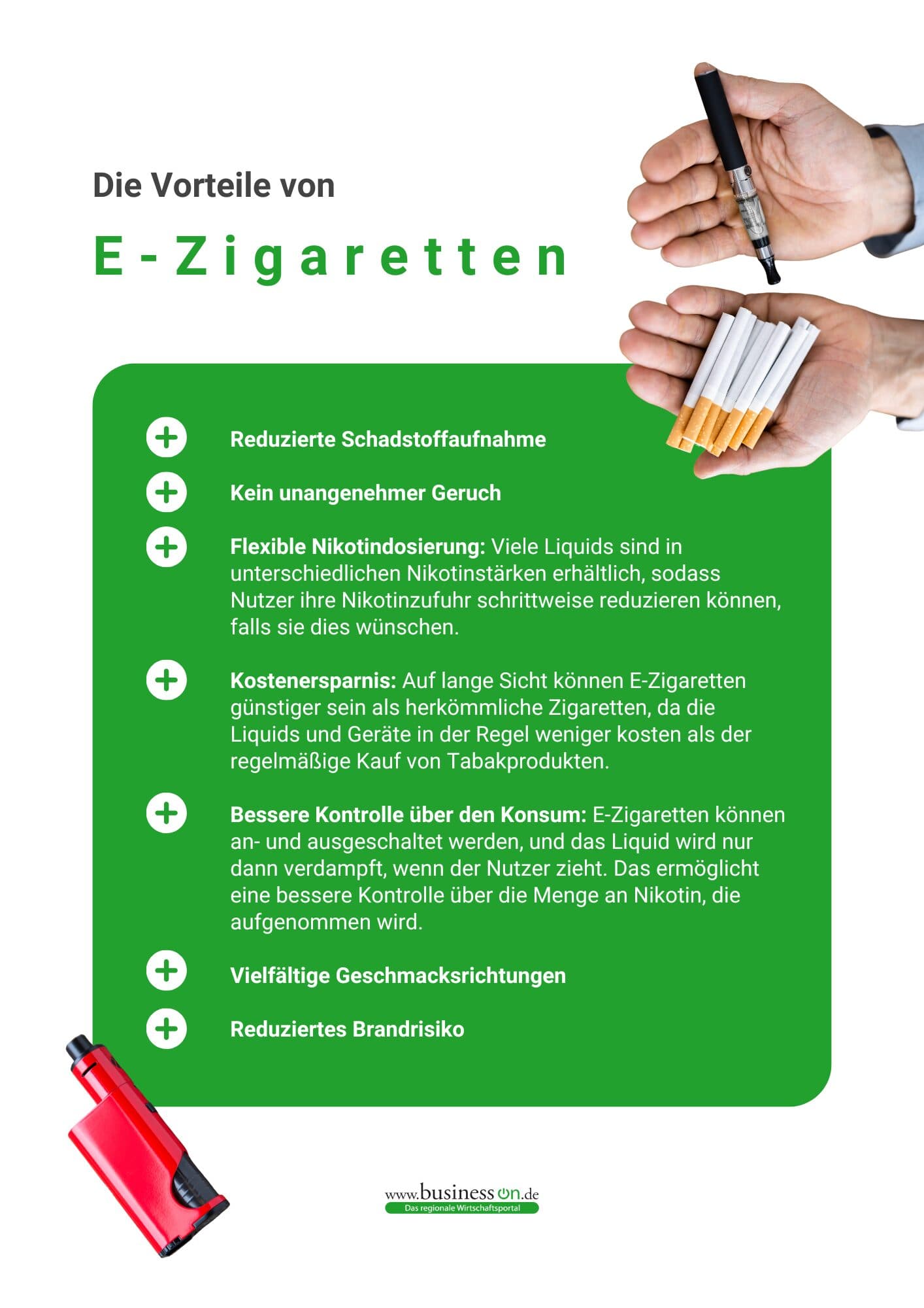Obwohl E-Zigaretten einerseits als Bedrohung für traditionelle Geschäftsmodelle wahrgenommen werden, eröffnen sie andererseits Möglichkeiten für Diversifizierung und Innovation. Langfristig wird die Zukunft des Marktes von regulatorischen Rahmenbedingungen, gesellschaftlichen Trends und der Fähigkeit der Industrie abhängen, sich an die neuen Gegebenheiten anzupassen. Die E-Zigarette ist mehr als ein Trend – sie hat das Potenzial, den Tabakmarkt fundamental zu transformieren.